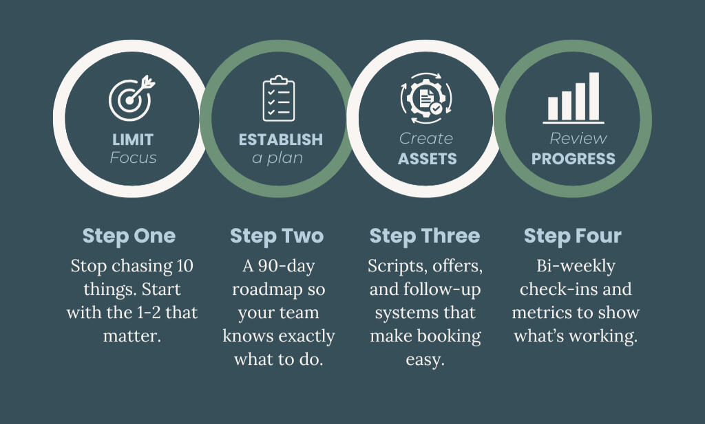 Most consultants will tell you to run more ads, post more on social, or "build your brand."But that's not your problem. Your problem is what happens AFTER someone shows interest—the messy middle where leads slip away, clients don't rebook, and revenue walks out the door.I specialize in that gap. In 90 days, we'll plug the leaks and build a sales process that actually converts.